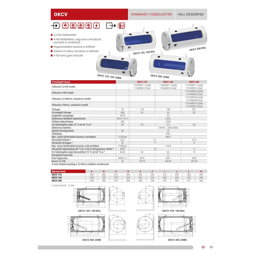 A Drazice OKCV 125L fali, fekvő kombinált villanybojler 2,2kW fűtőbetéttel van gyárilag felszerelve. A tároló alkalmas például egy gázkazán, vegyestüzelésű kazán, vagy egy szolár rendszer által biztosított meleg víz fogadására és hatékony tárolására.